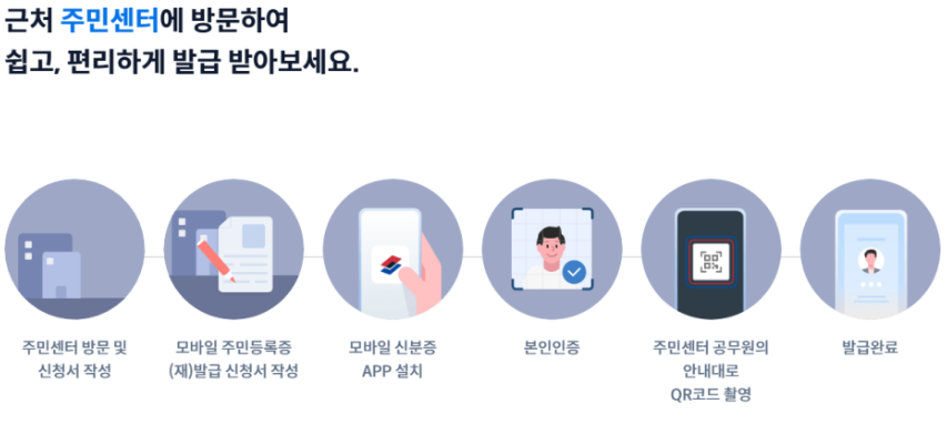 | 신청서 | 행정복지센터 방분 후 신청 및 발급 | IC칩 포함 주민등록증 발급 (행정복지센터 방문, 또는 정부 24 누리집 신청) 후 앱에서 본인 인증 |