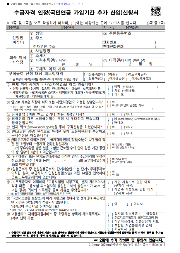 - 수급자격 인정 신청서는 노무제공자, 단기예술인, 상용, 일용 등으로 나눠서 신청서가 있음