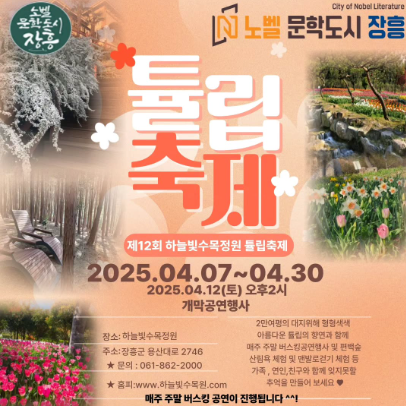 안녕하세요! 오늘은 장흥 하늘빛수목정원에서 열리는 튤립축제는 매년 봄, 특히 4월 초부터 중순 사이에 펼쳐지는 아름다운 봄꽃 축제입니다. 이곳은 전라남도 장흥군에 위치해 있으며, 사계절 다양한 꽃과 식물로 유명한 자연 친화적 수목정원인데요, 봄철에는 수만 송이의 튤립이 만개하면서 환상적인 꽃길이 만들어집니다.