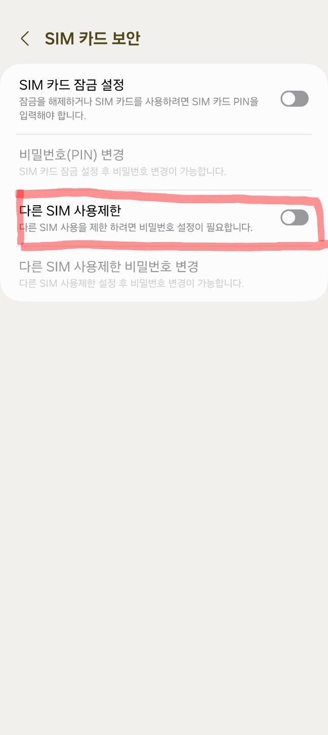 유심을 바꾸기 전에 “다른 SIM 사용제한”이 켜져 있는지 확인하고, 꺼야 합니다.